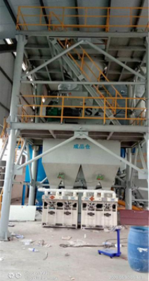 干粉砂漿設(shè)備主要由儲料罐,雙軸無重力混合機,提升機,待混倉,小料倉,成品倉,包裝秤,斗提機,除塵器,全自動計量配料秤倉,框架等組成。儲量罐主要用來儲存原料,一般容量為60立方,數(shù)量為3個,用來儲存水泥,粉煤灰,沙子等物料,生產(chǎn)時根據(jù)客戶的配方將水泥,粉煤灰,沙子按比例輸送到配料秤倉內(nèi),在由配料秤倉將配好的物料送到斗提機內(nèi),纖維素、膠粉等小比例貴重母料可通過電子秤計量投入外加劑料斗,經(jīng)斗提機將物料提升到框架上面的待混倉內(nèi)等待混合,然后將物料卸入雙軸無重力混合機內(nèi)進行混合,混合后的物料由氣動門進入成品倉內(nèi),再由閥口包裝機進行包裝即可完成操作,與簡易型生產(chǎn)線相比又了一步。
