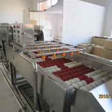 主要功能: 將前道整理去雜等工序清理切割完畢的干凈蔬菜,通過強力多道渦流循環(huán)、高壓水流沖浪、翻轉、高壓噴淋振動瀝水幾種清洗方式,在道清洗槽中使用渦流、沖浪、高壓噴淋。蔬菜在經過第二段渦流、沖浪、振動瀝水,同時用凈水沖淋(可加冰水冷卻),使小