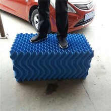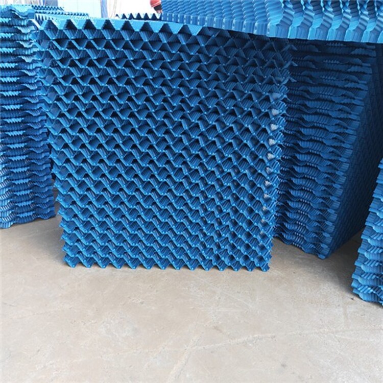 系用硬質(zhì)薄片(聚氯乙烯片、聚丙烯片、玻璃鋼片、薄鋁片等)壓成斜波浪形。斜波傾角有30°、45°、60°、75°等,組裝時(shí)相鄰二片斜波傾角交錯(cuò)排列,所以常稱斜交錯(cuò)波紋填料。通常使用的規(guī)格有35mm×15mm—60°、50mm×20mm—60°(波距×波高—斜角)兩種。前者散熱,但孔眼小、阻力大、易堵塞;后者散熱效率雖稍差,但孔眼大、阻力小、不易堵塞。斜交錯(cuò)波紋填料是機(jī)械通風(fēng)冷卻塔中應(yīng)用廣的填料。逆流塔多用60°斜波填料,橫流塔多用30°斜波填料。