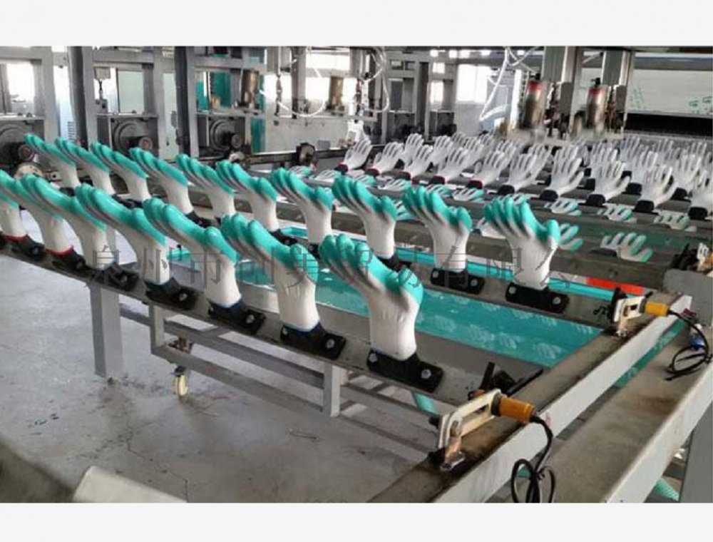 九、后所使用的手套從模具上剝離,使浸漬了氯水或淀粉水的手套面被翻轉(zhuǎn)向內(nèi),就獲得浸膠勞保手套成品。