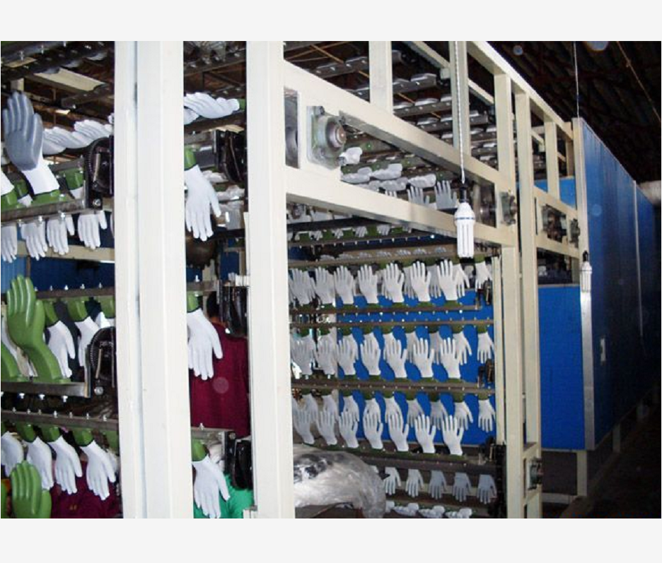 七、浸膠完成的手套模具在120~140℃干燥25~35分鐘,使膠乳成型為手套本體;