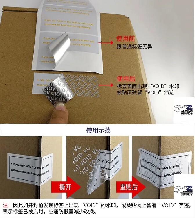 防偽標(biāo)簽,這種標(biāo)簽可采用PET面材,可制成啞銀、光銀、閃銀、激光、白色等多種色彩透明、不透明的材料,留底可以使用“VOID”、“保修已失效”或品牌名稱等字樣(字模)。