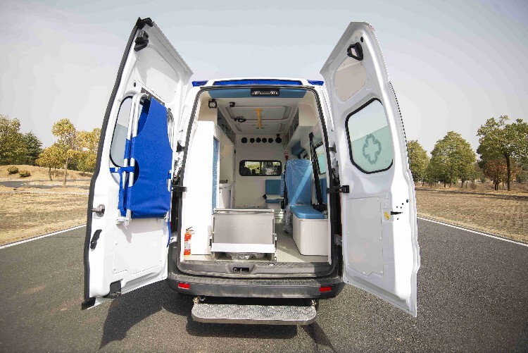 轉運型救護車配置:藍色長條救護燈;駕駛室警報裝置;中隔板帶推拉窗;救護外觀及徽標;地柜;氧氣瓶及固定裝置;紫外線燈1只;輸液掛鉤2只;照明燈2只;左側可躺座椅2張;右側長條座柜1張;后艙玻璃貼磨砂膜;普通輪式上車擔架及固定裝置;藍色地板膠;污物桶1只;加裝暖風裝置1只;加裝后空調。