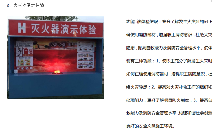 1.通過(guò)滅火器的靜態(tài)展示,使體驗(yàn)人員熟悉常用滅火器的使用方法,教育體驗(yàn)人員不能隨意破壞、挪動(dòng)消防器材。2.在消防體驗(yàn)中,利用電子噴火機(jī)形成模擬火焰環(huán)境,體驗(yàn)者使用手提式電子滅火器模擬撲滅火焰。讓體驗(yàn)者學(xué)會(huì)常見(jiàn)安全知識(shí),充分認(rèn)識(shí)遵守操作規(guī)程的重要性,預(yù)防和減少施工過(guò)程中安全事故的發(fā)生。