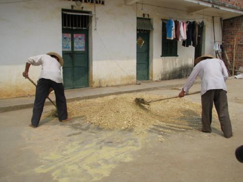 以發(fā)酵豆渣200公斤為例, 200公斤豆渣加20公斤麥麩或玉米面,如果豆渣比較濕,可以適當晾曬或者加入適量的糠或秸稈粉(用于調(diào)整豆渣的干濕度,靈活使用),一公斤菌碼特菌碼特養(yǎng)殖菌種加30公斤左右水稀釋,(加水主要是方便菌碼特養(yǎng)殖菌種原液和需要發(fā)酵的材料能夠混合均勻,自己控制加水量)。以上所有原料混合攪拌均勻后,水分控制在50%左右后即可壓實密封發(fā)酵,時間為5~10天(視氣溫而定)有微微酒香味或酸香味飄出即可飼喂。開始使用時,建議把上面薄薄白色的那一層丟掉不要,每次取料后要馬上再次嚴格密封,防止腐敗變質(zhì)。發(fā)酵后的飼料,如果要長期保存,則要嚴格密封并壓緊壓實處理,盡量排出包裝袋中的空氣,這樣不僅可以長期保存,而且在保存的過程中,發(fā)酵還要在進行,時間較長后,消化吸收率更好,營養(yǎng)更佳。
